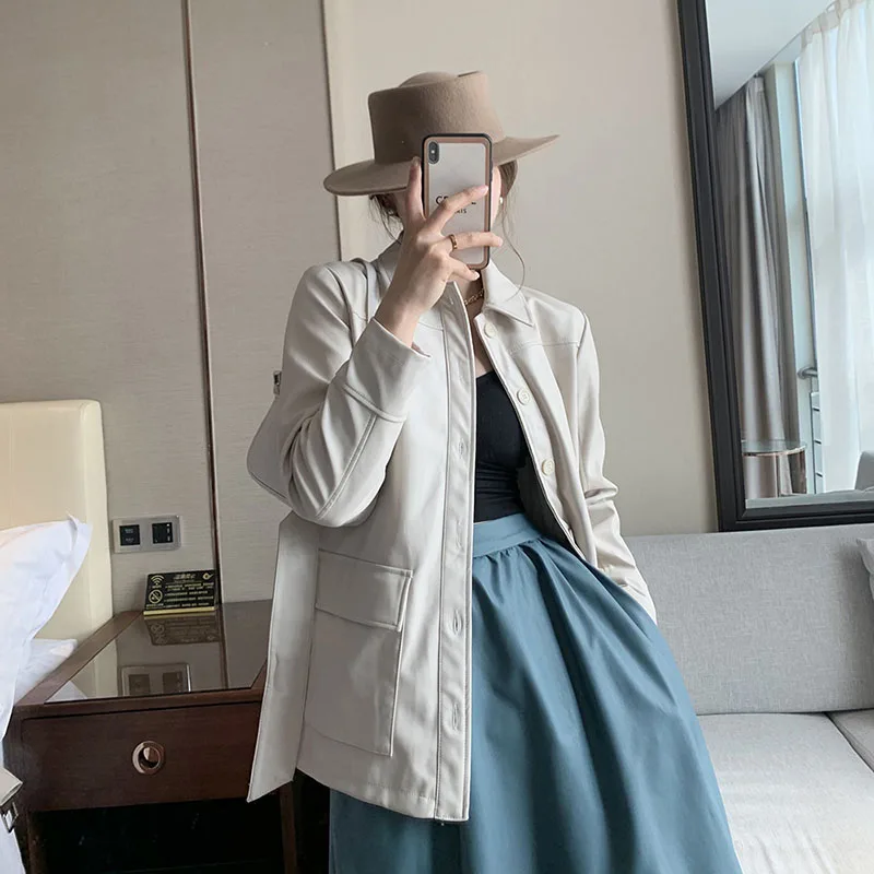 Best High Street Women Leather Coat Black Mid-length Faux Leather Jacket With Belt Punk Biker Jacket Ladies Basic Coats Loose Outwear and You will save 53% or US $36.69 today